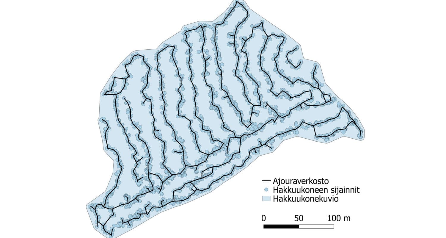 Hakkuukoneen sijaintitiedon avulla pystytään tuottamaan laskennallisesti mm. hakattujen kuvioiden aluerajaukset, ajouraverkostot ja ajouratunnuksia. MMM Mikko Hakalan maisterintutkielmassa määritettiin operatiivisten hakkuukonekuvioiden rajausten osuvuutta koko Suomen mittakaavassa. Kuvioinnin tarkkuus on riittävä metsävaratietojen ajantasaistukseen. Työn perusteella myös laskennalliset, koko kuvion kattavat ajouratunnukset ovat käyttökelpoisia puunkorjuun laadun arvioinnissa.