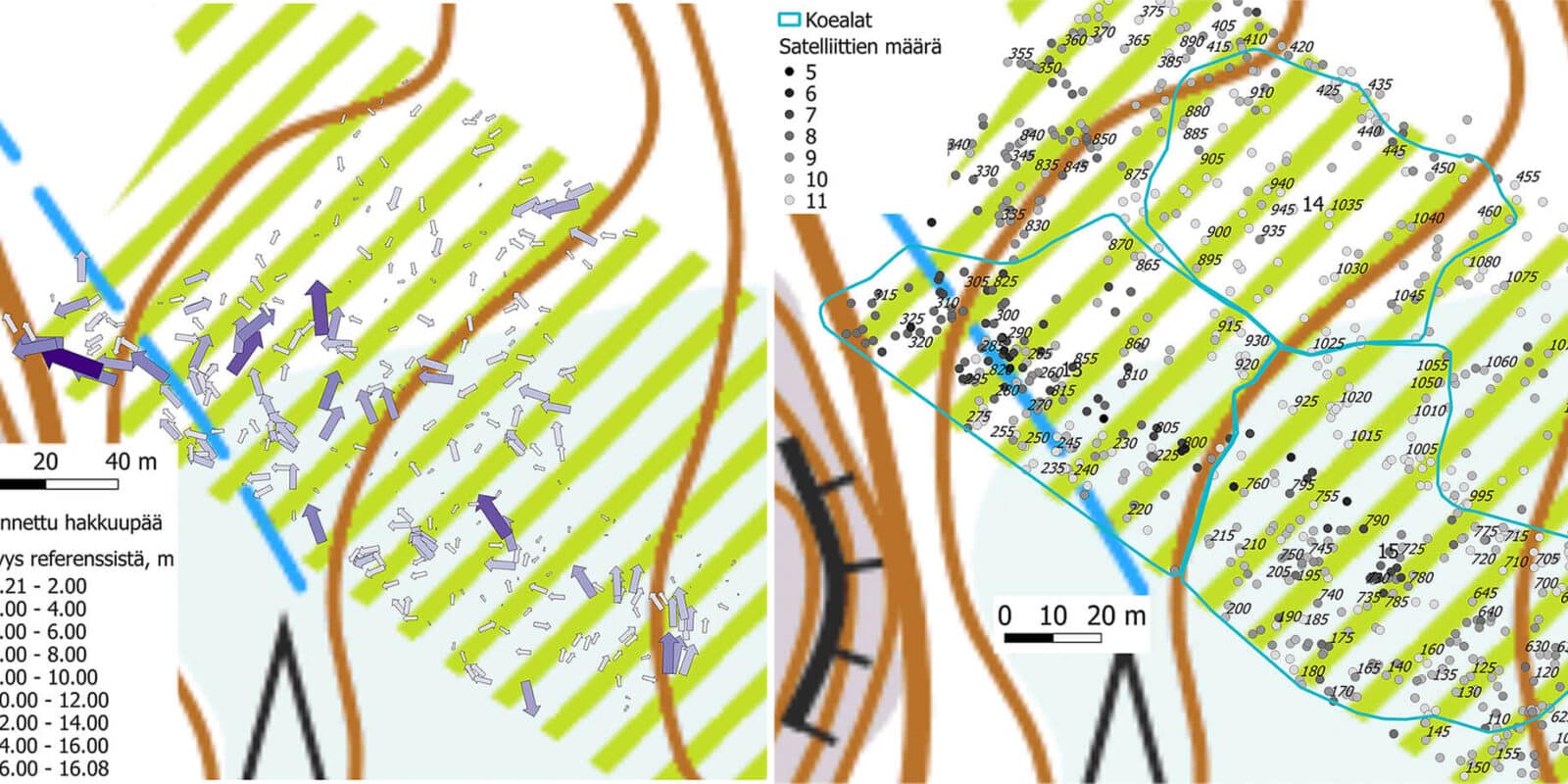 Hakkuupään sijaintivaihtoehdoille määritettiin sijaintitarkkuudet referenssikantoihin nähden. Aineisto sisälsi kaikkiaan yli 2200 kanto-runko-vastinparia ja tutkimusalueet oli jaettu maasto-ominaisuuksien mukaisesti 22 koealaan.