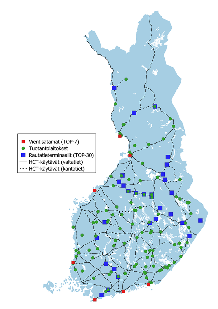 Ehdotettuja HCT-reittejä raakapuun, sivutuotehakkeen ja sahatavaran kuljetuksiin (Metsäteollisuus ry:n ja Metsäteho Oy:n kyselyt metsäyhtiöille). Lisäksi maksimissaan 84-tonnisille ehdotetaan tässä esitettyä laajempaa verkkoa (tarvittaessa olosuhteiden salliessa). Lähde: Venäläinen & Poikela 2019.