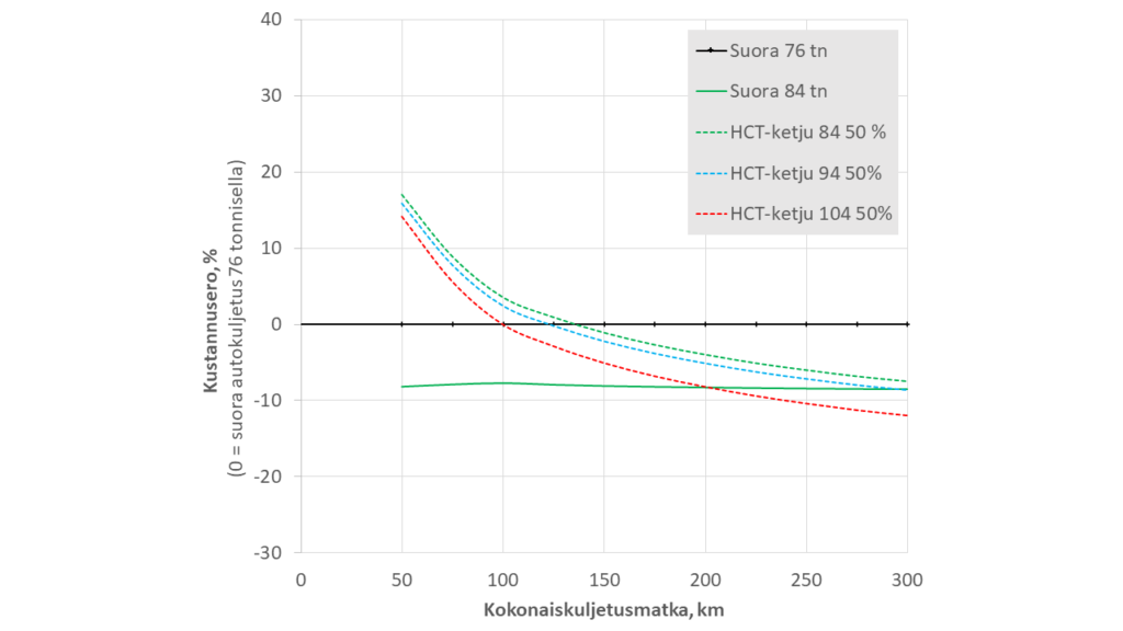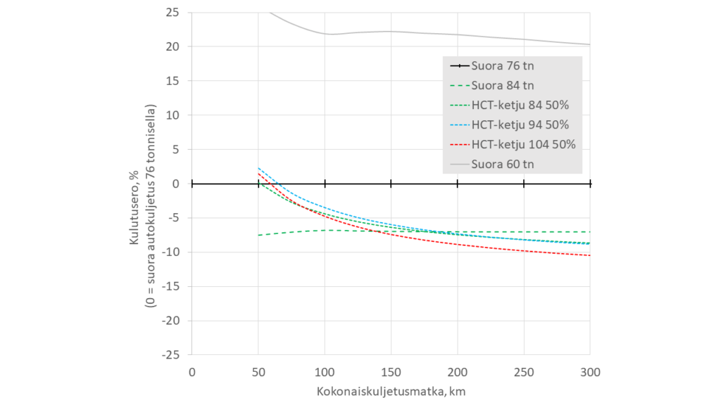 Ajoneuvon kokonaispainon kasvaessa hyötykuorman suhteellinen osuus kokonaispainosta nousee. Metsäteho Oy:n laskelmien mukaan HCT-yhdistelmillä saavutetaan puutavaran kuljetuksissa parhaimmillaan 8 – 12 %:n säästö kuljetettua kuutiota kohden (riippuen kuljetusmatkasta ja HCT-yhdistelmän koosta). Suurimmat HCT-ajoneuvot eivät useinkaan pysty ajamaan käyttökohteeseen suoraan metsästä, joten käytännössä siirtokuormaus matkalla on usein tarpeen. Tämä vähentää ko. HCT-kuljetusten kustannusetua. Terminaalivaiheella voi kuitenkin olla useita logistisia etuja, joita tunnistettiin Energiatehokkaat terminaalitoiminnot puutavaralogistiikassa -hankkeen yhteydessä. Siirtokuormaus voidaan myös korvata valmiiksi kuormattujen ja tyhjien perävaunujen nopealla vaihdolla. Siirtokuormaus ei ole tarpeen, kun HCT-yhdistelmää käytetään tehtaiden välisiin kuljetuksiin (esim. puutavaralajien vaihdot ja sivutuotehakkeen kuljetukset sahoilta sellutehtaisiin).