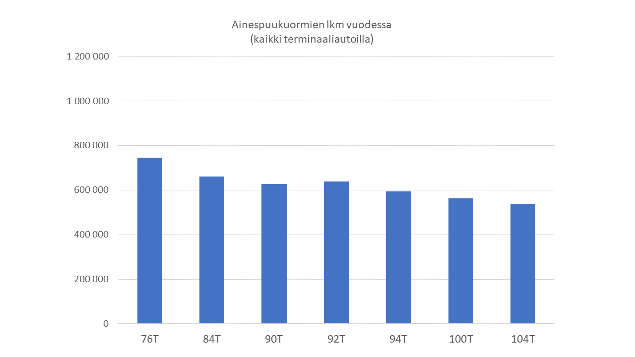 Suurempia ajoneuvoyhdistelmiä hyödyntämällä voidaan vähentää ajettujen kuormien lukumäärää (kun kuljetettava puumäärä pysyy samana). Tämä vähentää mm. onnettomuusriskiä. 84-tonnisilla metsäautoilla vähennettäisiin vuosittaisten ajojen määrää lähes 110 000:lla 76-tonnisiin verrattuna. HCT-kokeiluissa mukana olleet terminaaliautot vähentäisivät puolestaan vuosittaisten ajojen määrää 85 000– 210 000:lla (kuva alla). HCT-hakeyhdistelmät vähentäisivät kuormien määrää 76-tonnisiin nähden 35 000–130 000:lla vuodessa.