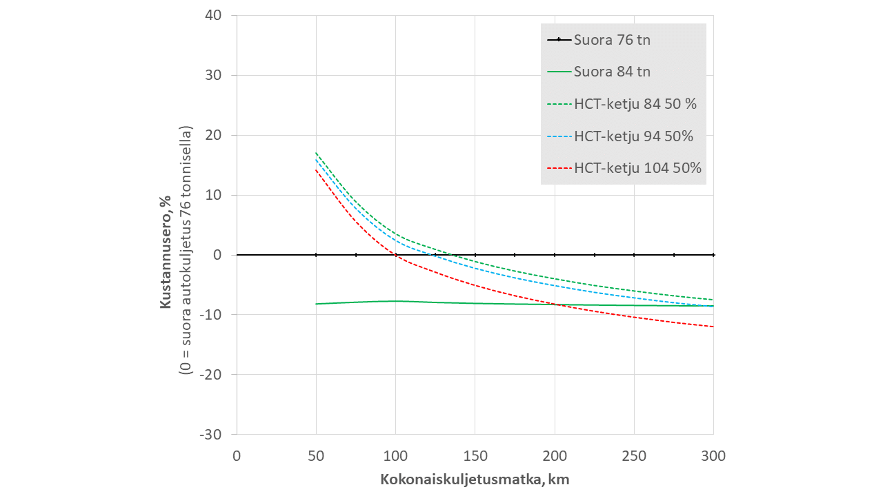 Ajoneuvon kokonaispainon kasvaessa hyötykuorman suhteellinen osuus kokonaispainosta nousee. Metsäteho Oy:n laskelmien mukaan HCT-yhdistelmillä saavutetaan puutavaran kuljetuksissa parhaimmillaan 8 – 12 %:n säästö kuljetettua kuutiota kohden (riippuen kuljetusmatkasta ja HCT-yhdistelmän koosta). Suurimmat HCT-ajoneuvot eivät useinkaan pysty ajamaan käyttökohteeseen suoraan metsästä, joten käytännössä siirtokuormaus matkalla on usein tarpeen. Tämä vähentää ko. HCT-kuljetusten kustannusetua. Terminaalivaiheella voi kuitenkin olla useita logistisia etuja, joita tunnistettiin Energiatehokkaat terminaalitoiminnot puutavaralogistiikassa -hankkeen yhteydessä. Siirtokuormaus voidaan myös korvata valmiiksi kuormattujen ja tyhjien perävaunujen nopealla vaihdolla. Siirtokuormaus ei ole tarpeen, kun HCT-yhdistelmää käytetään tehtaiden välisiin kuljetuksiin (esim. puutavaralajien vaihdot ja sivutuotehakkeen kuljetukset sahoilta sellutehtaisiin).