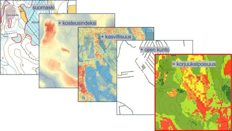 Korjuukelpoisuuskartat auttavat arvioimaan, missä olosuhteissa korjattavaksi suunniteltu kohde on kantavuuden puolesta toteutettavissa. Kartat kattavat jo noin 80 % metsäpinta-alasta.