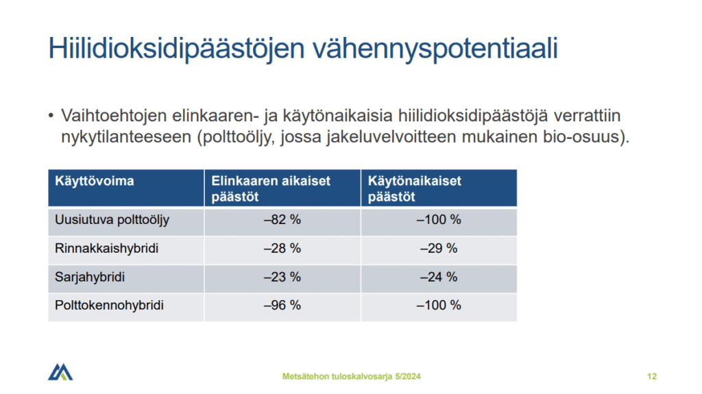 Tutkimuksessa selvitettiin suositeltavinta käyttövoimaratkaisua uiton apualuksille. Apualukset ohjaavat uittokuormaa kuljetusreitin haastavissa kohdissa, ja hinaavat pienempiin osiin puretun uittolautan kapeiden kanavien lävitse. Tutkimuksessa verrattiin uusiutuvan polttoöljyn, rinnakkais- ja sarjahybridin sekä polttokennohybridin hiilidioksidipäästöjen vähennyspotentiaalia nykyisen jakeluvelvoitteen mukaista polttoöljyä käyttävään polttomoottoriin. Lisäksi verrattiin näiden ratkaisujen käyttövoima- ja hankintakustannuksia.